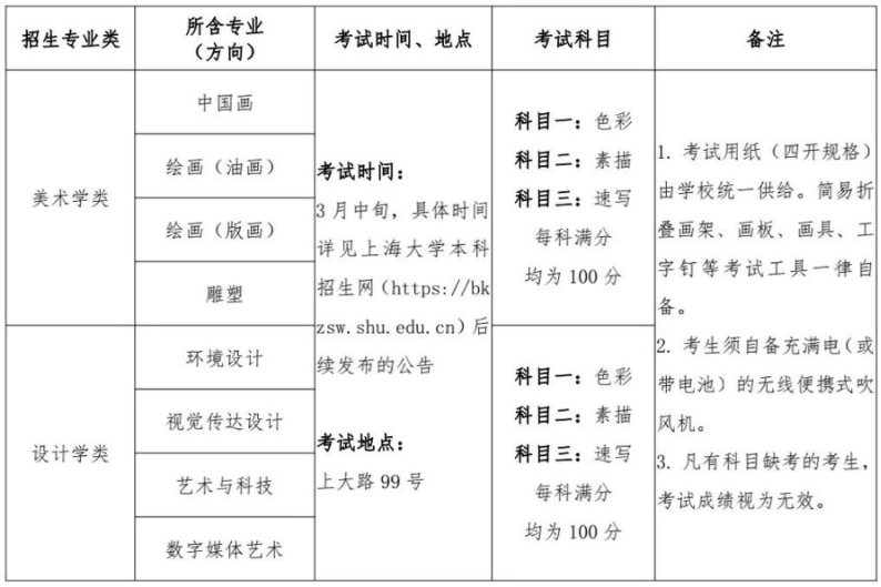 美术学类【中国画、绘画(油画)、绘画(版画)、雕塑】、设计学类【环境设计、视觉传达设计、艺术与科技、数字媒体艺术】专业投档至上海大学的考生: