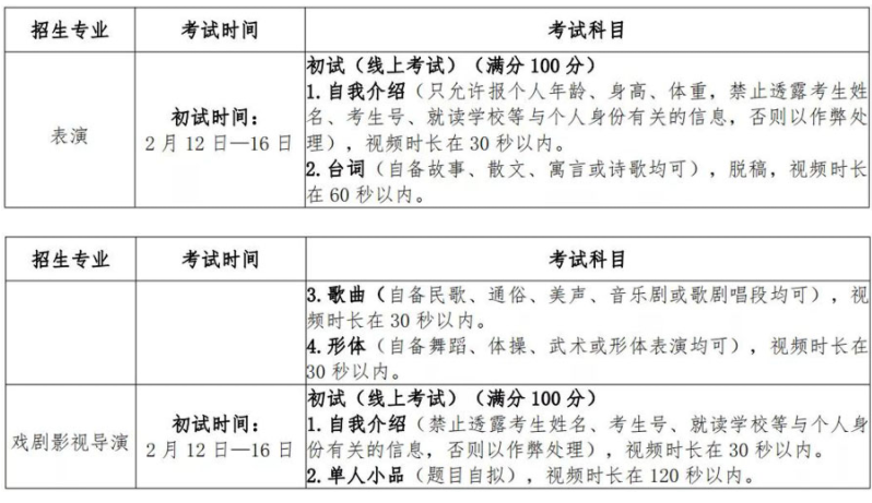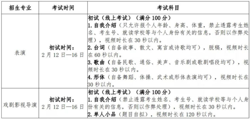 (1) 表演、戏剧影视导演专业初试为线上考试,考生可于 1 月24 日起进行考前练习。考前练习及正式考试安排预计于 1 月 20 日—1 月 22 日期间在上海大学本科招生网(https://bkzsw.shu.edu.cn) 发布。复试、三试的具体安排详见上海大学本科招生网(https://b kzsw.shu.edu.cn)后续发布的公告。